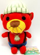 He is a red sea otter, with a yellow muzzle, a brown nose and whiskers, as well as wide black eyes.